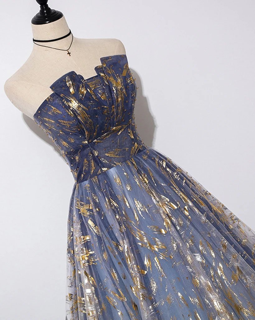 A Line Blue Tulle Strapless Long Prom Dress, Floor Length Graduation Dresses UQ2553