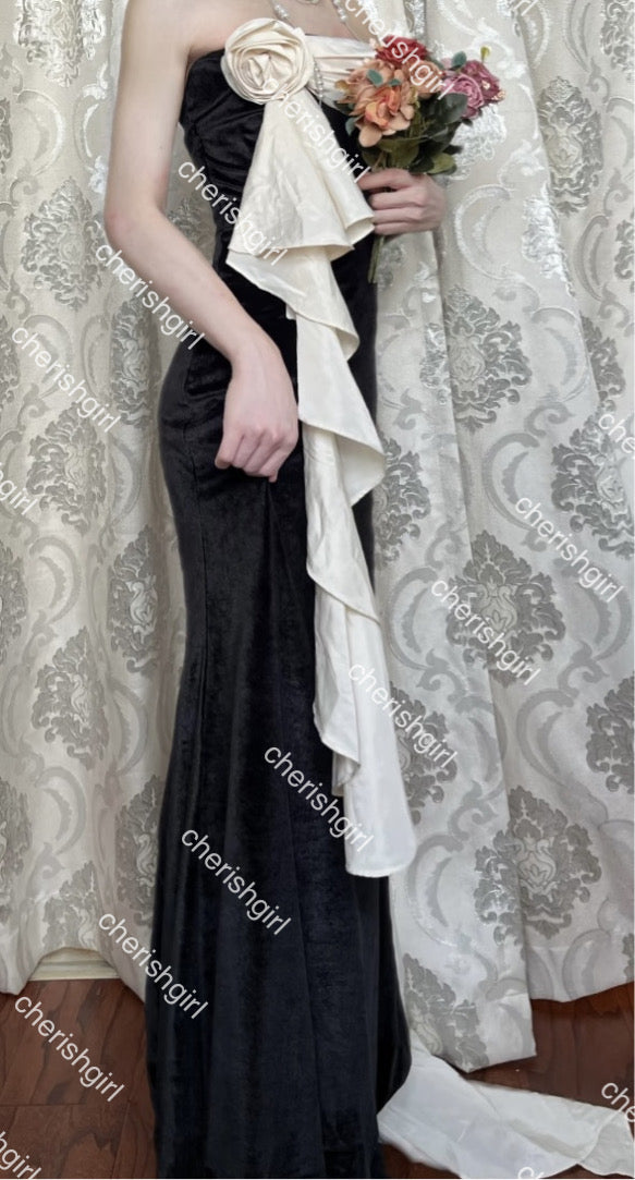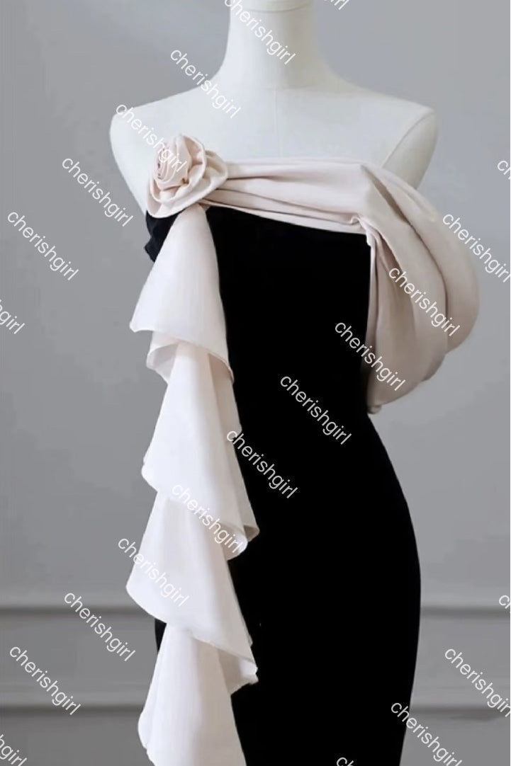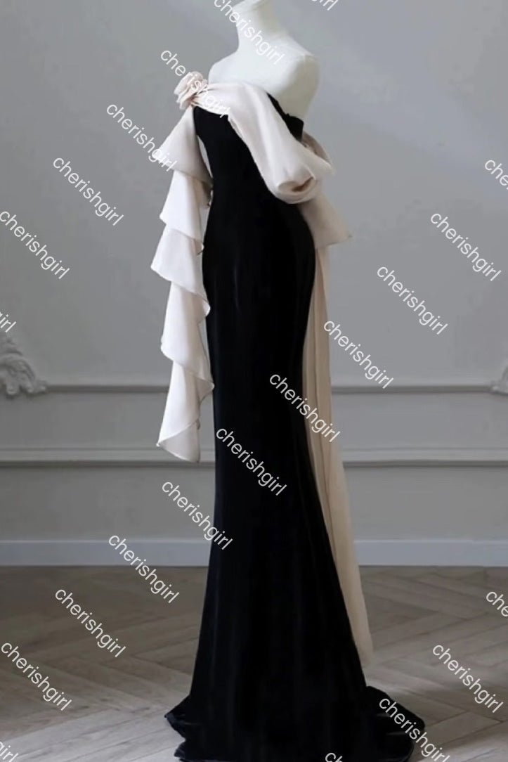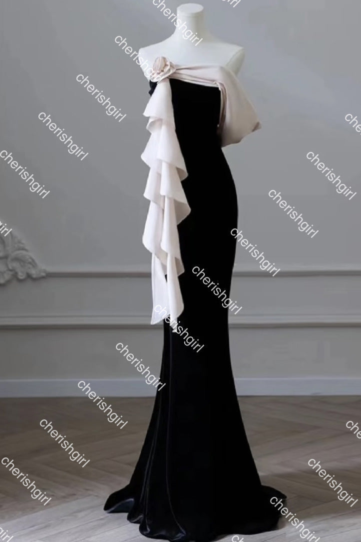 Black Mermaid One-Shoulder Long Prom Dress With Flower, Evening Dresses CHP0406