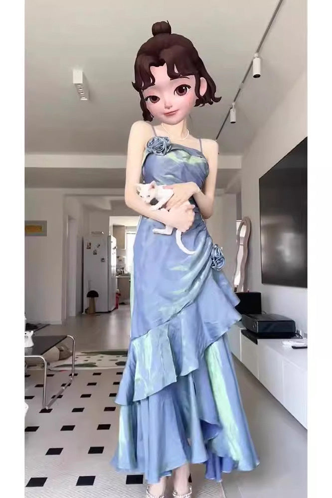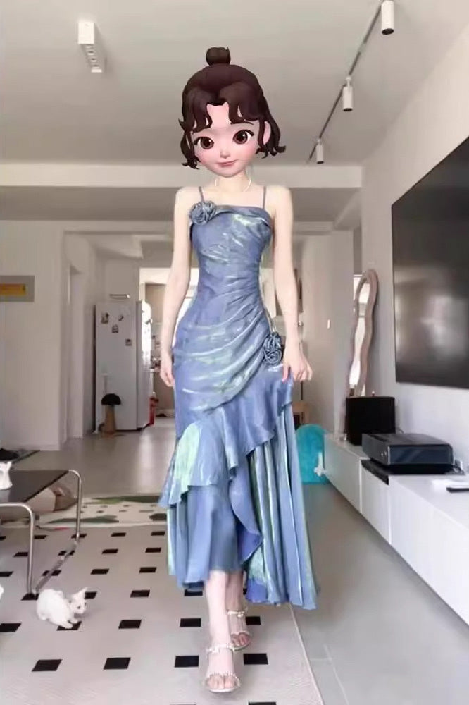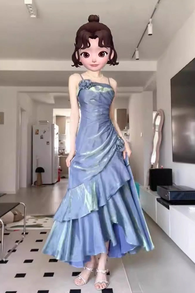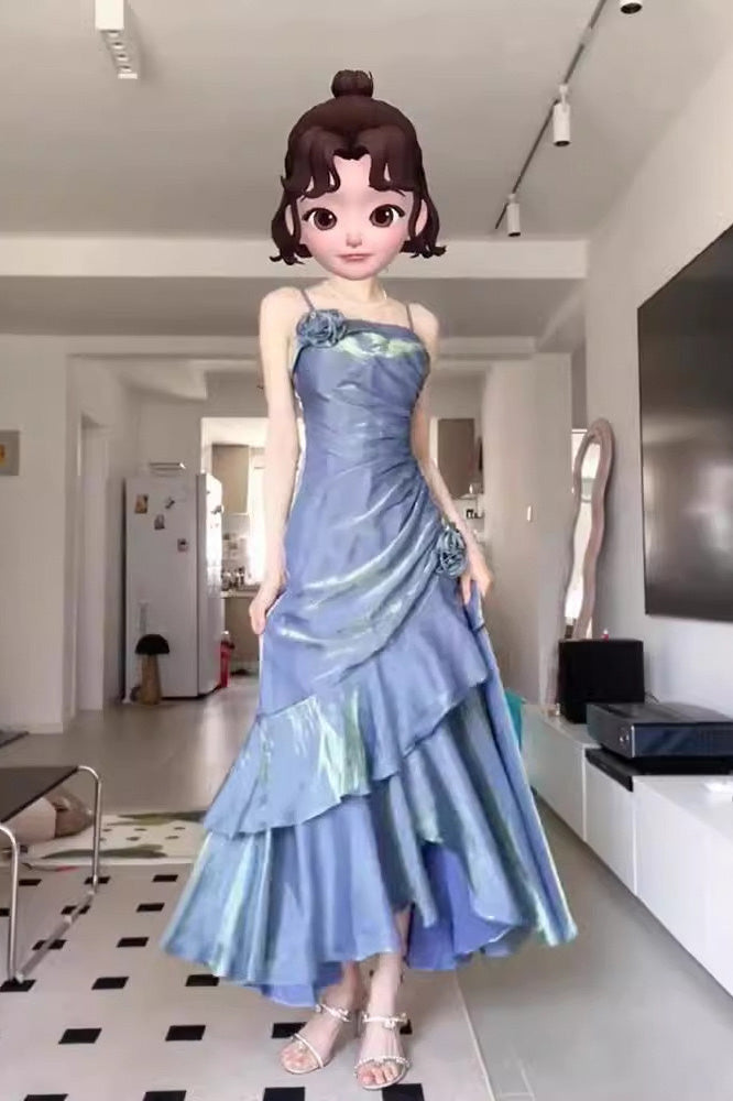 Blue A Line Spaghetti Straps Prom Dress, Elegant Evening Gown With Flowers CHP0347