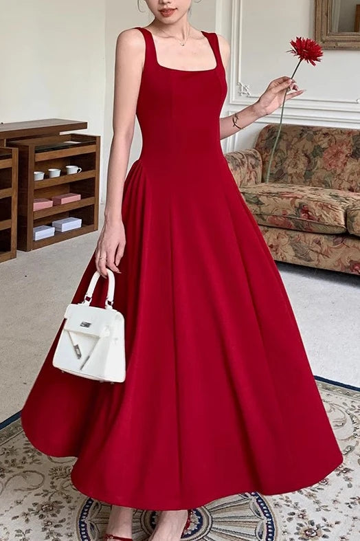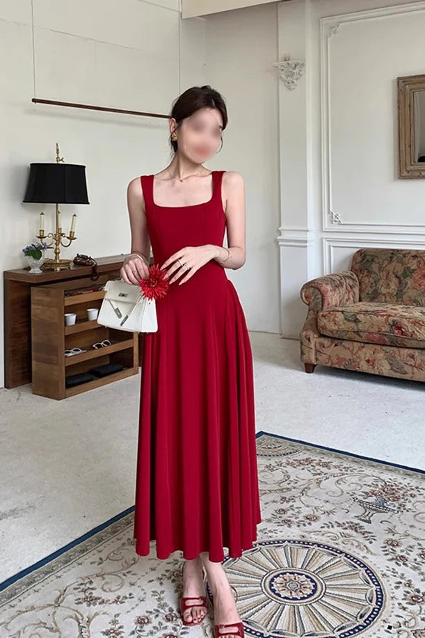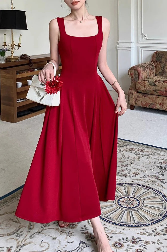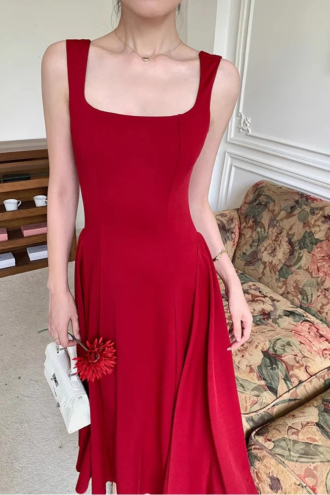 Burgundy Ankle Length Square Neck Sleeveless Stretch Satin Prom Dress CHP0385