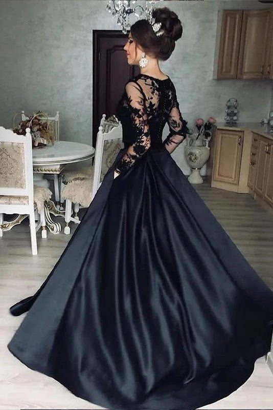 Illusion Lace A-Line Black Satin Long Sleeves Wedding Dress, Bridal Gown CHW0197