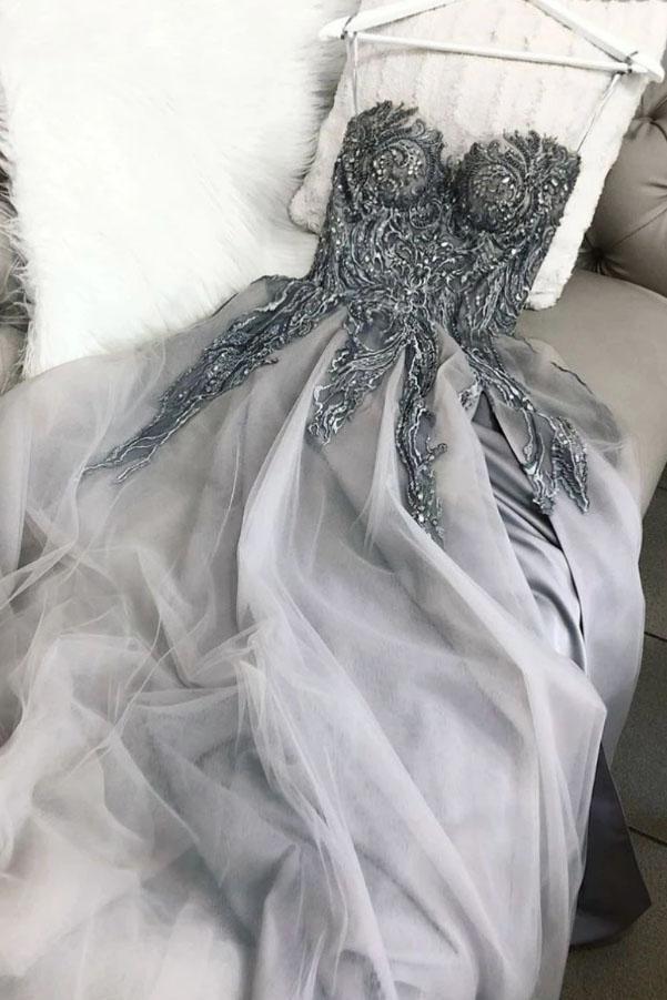 Light Gray Sweetheart Tulle Appliqued Prom Dress with Lace Up Back, A Line Evening Dress UQ2607