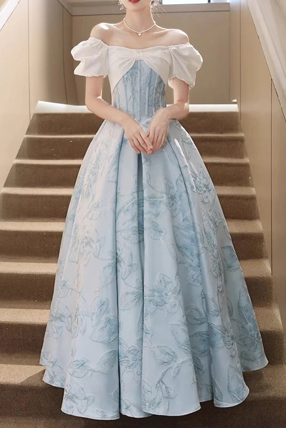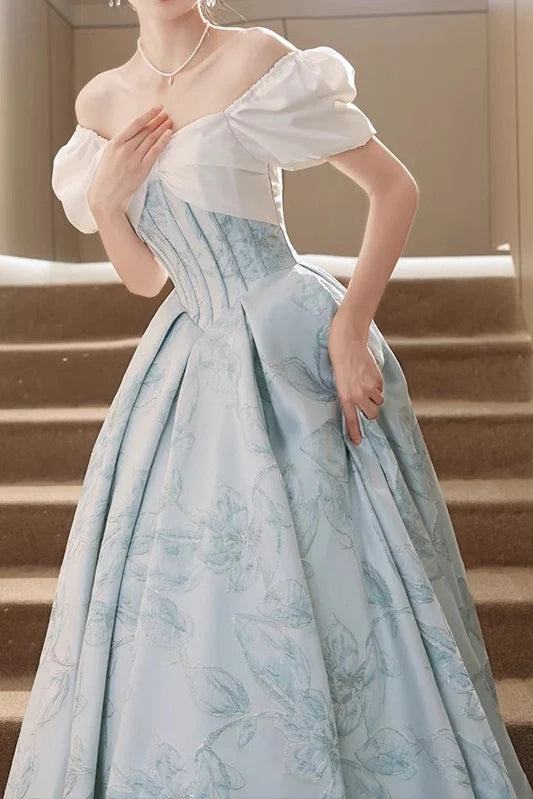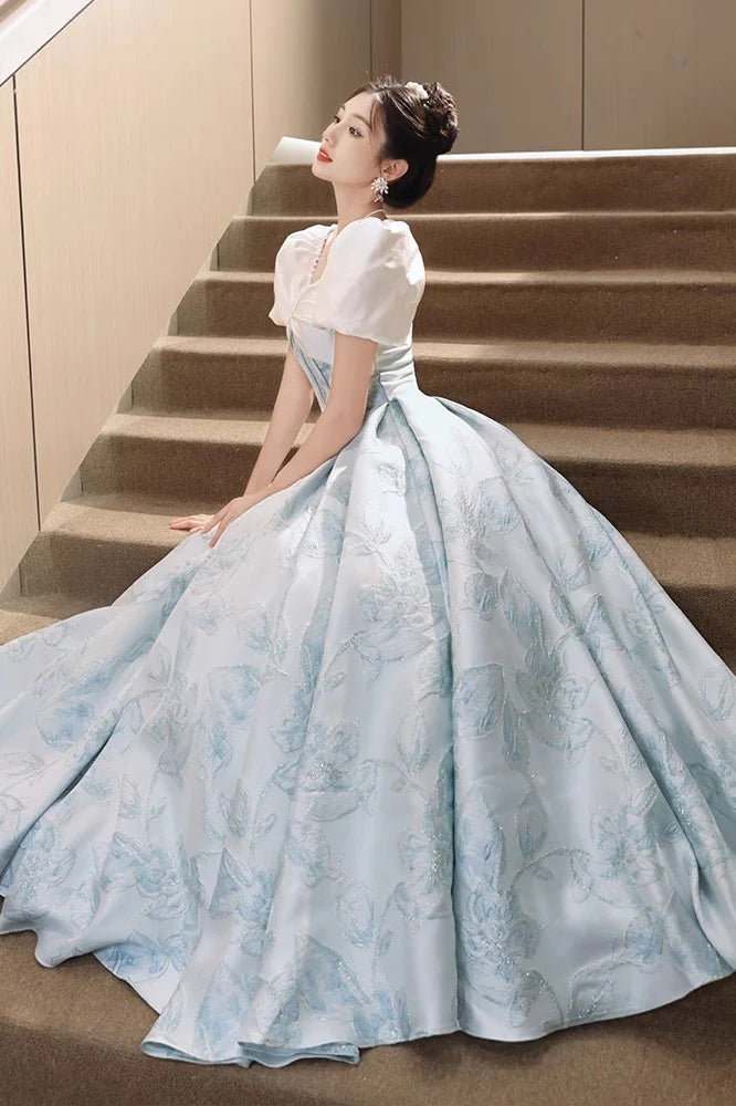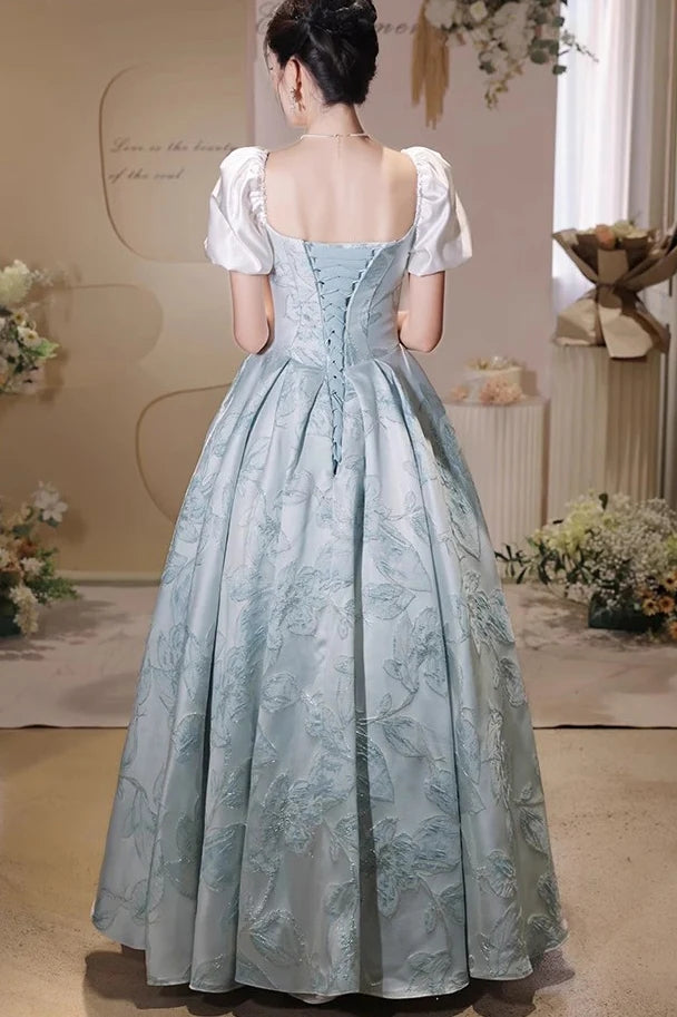 Puffy Square Neck Light Blue Long Prom Dress, A Line Tiered Party Gown CHP0397