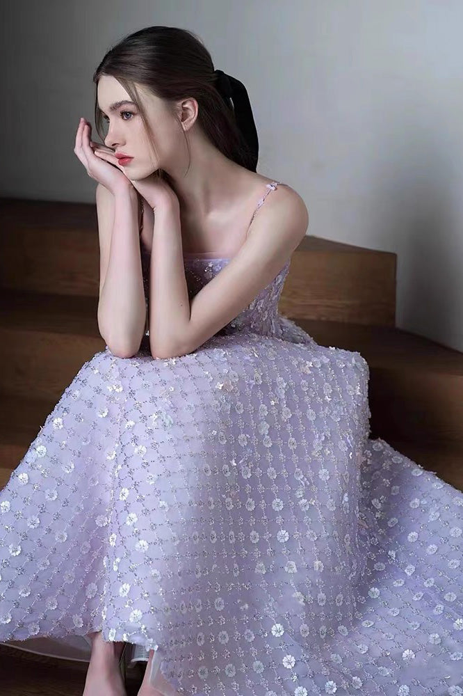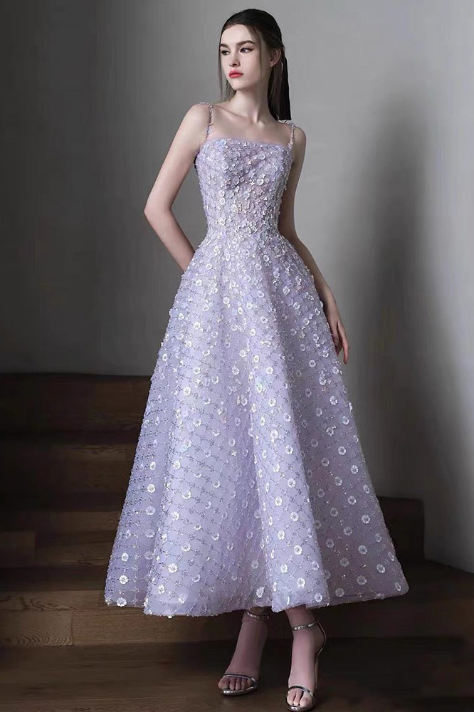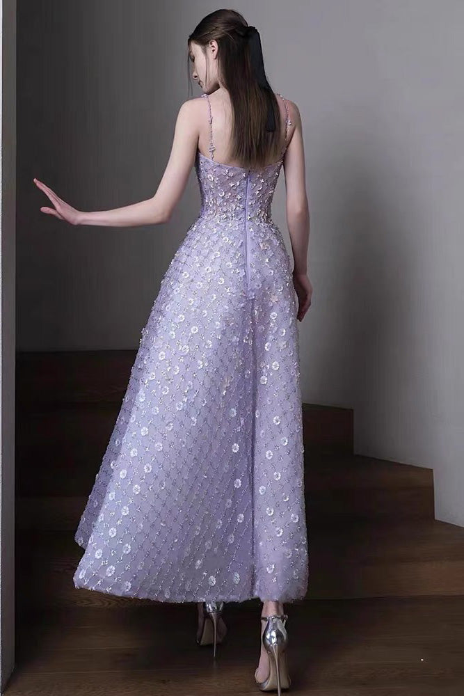 Purple Spaghetti Straps A Line Prom Dress, Ankle-Length Evening Gown CHP0349