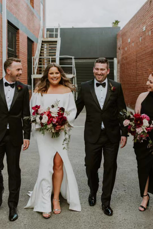 Simple White Satin Off-the-Shoulder Beach Wedding Dresses With Slit, Bridal Gowns WLD0136