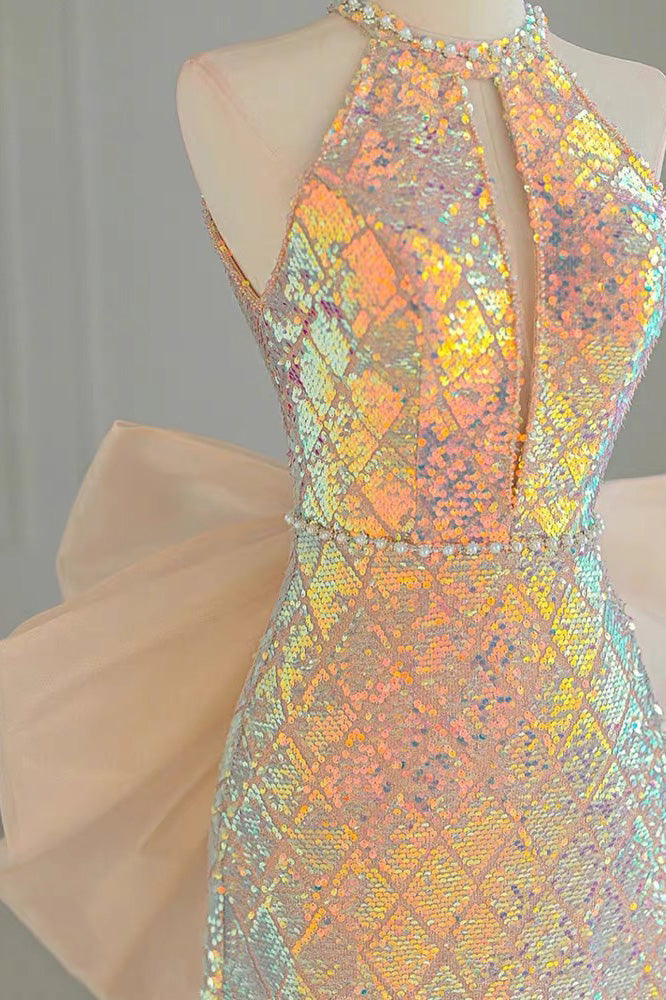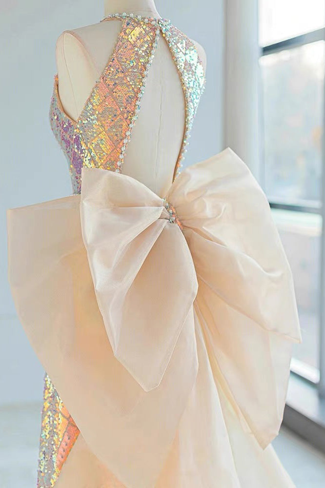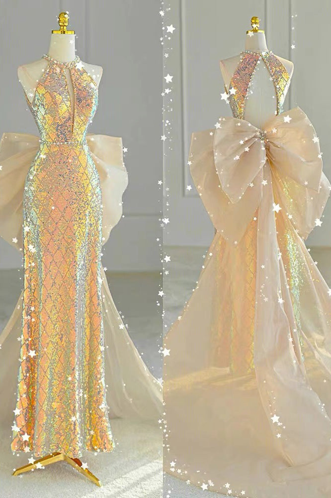 Unique Halter A Line Prom Dress, Open back Evening Gown With Bowknot CHP0350